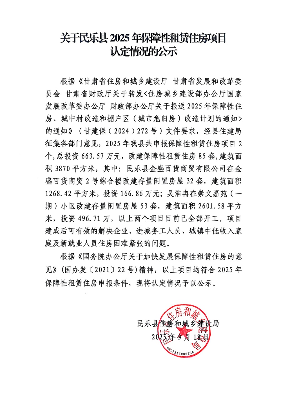 关于民乐县2025年保障性租赁住房项目认定情况的公示