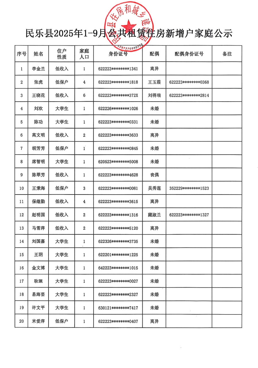 民乐县2025年1-9月公共租赁住房新增户家庭公示
