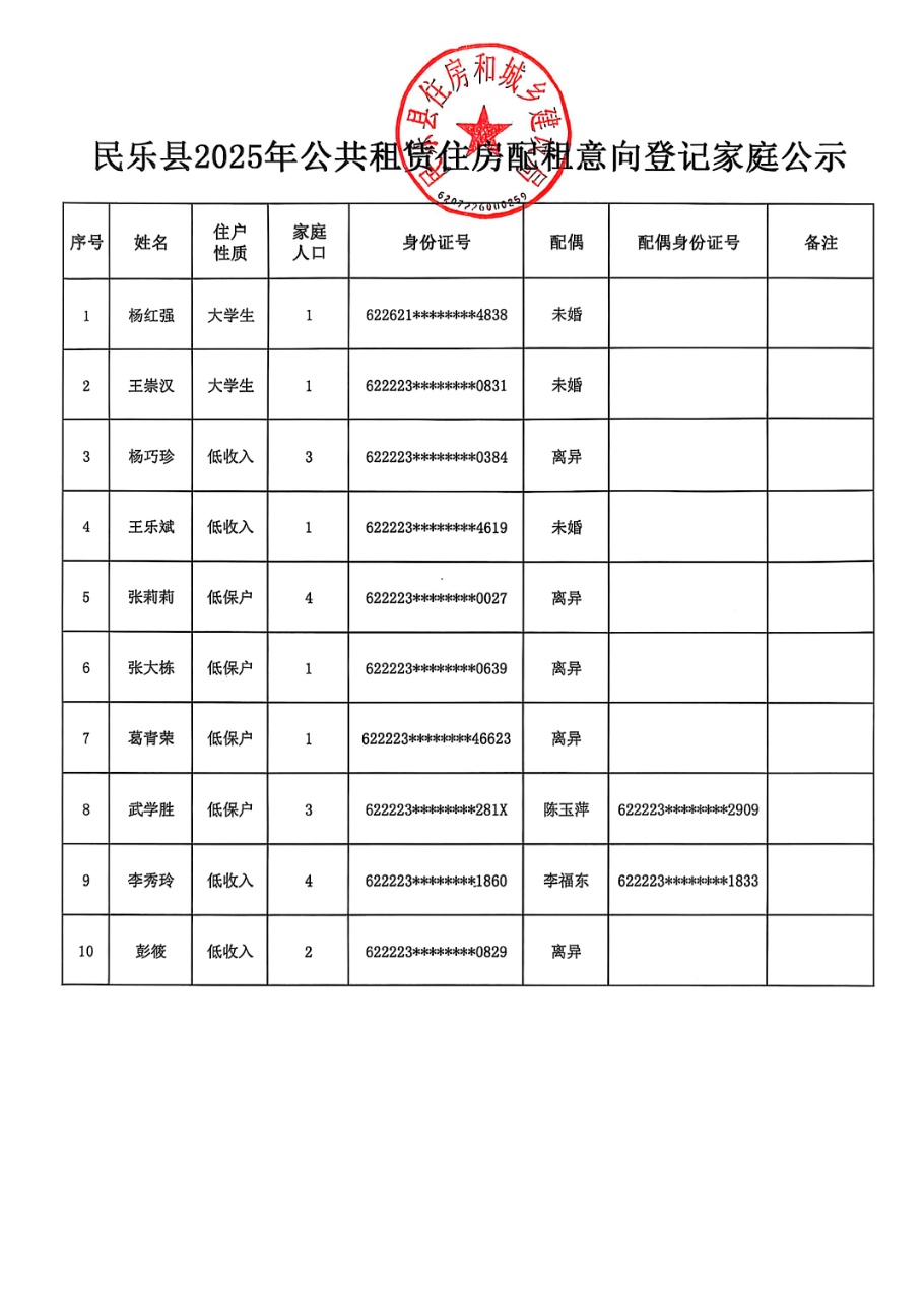 民乐县2025年公共租赁住房配租意向登记家庭公示