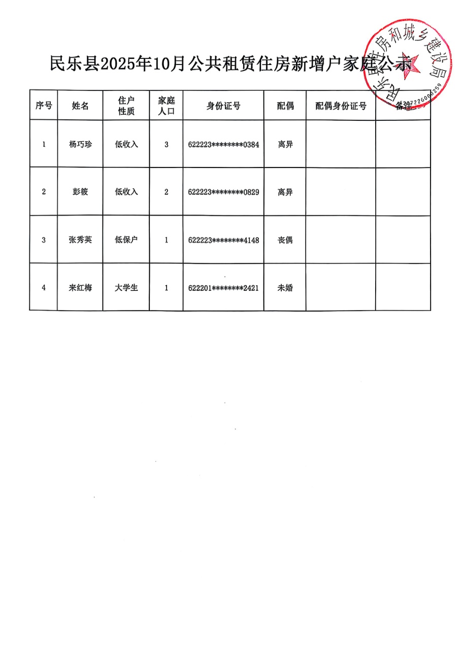 民乐县2025年10月公共租赁住房新增户家庭公示