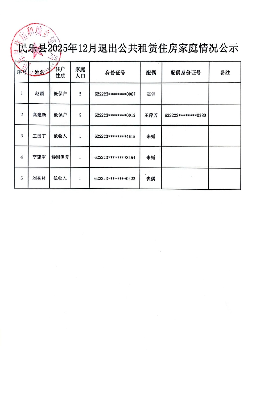 民乐县2025年12月退出公共租赁住房家庭情况公示