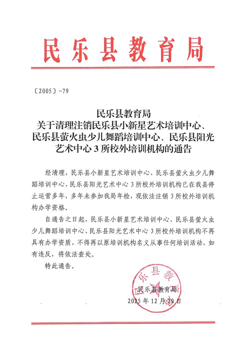 民乐县教育局关于清理注销民乐县小新星艺术培训中心、民乐县萤火虫少儿舞蹈培训中心、民乐县阳光艺术中心3所校外培训机构的通告