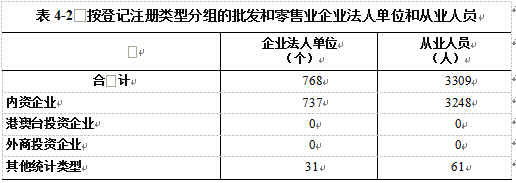 在批发和零售业企业法人单位从业人员中,内资企业占98.2%,港澳台投资企业占0%,外商投资企业占0%(详见表4-2)。