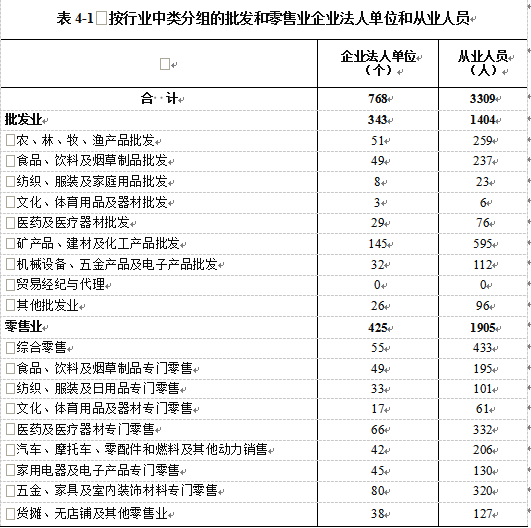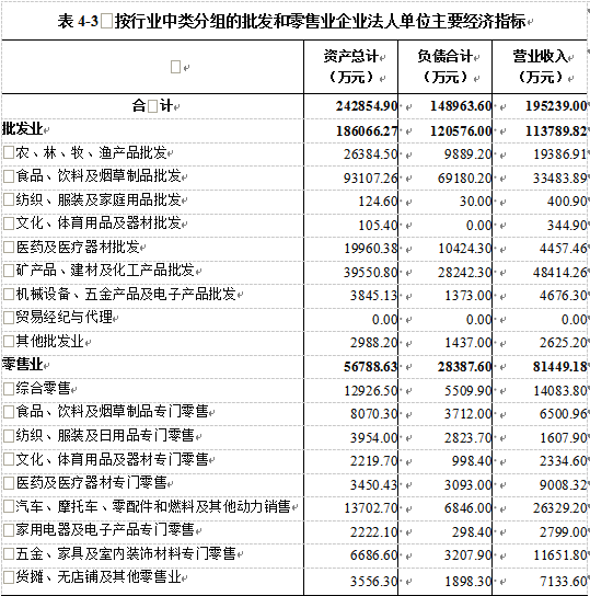 在批发和零售业企业法人单位中,批发业占44.7%,零售业占55.3%。在批发和零售业企业法人单位从业人员中,批发业占42.4%,零售业占57.6%(详见表4-1)。