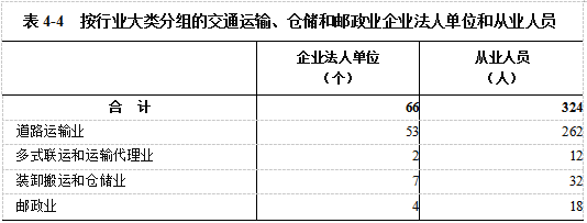 2023年末,全县共有交通运输、仓储和邮政业企业法人单位66个,比2018年末增长371.43%,从业人员324人,分比2018年末下降38.64 %(详见表4-4)。