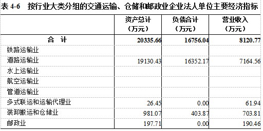 2023年末,交通运输、仓储和邮政业企业法人单位资产总计20335.66万元,比2018年末增长14.71%;负债合计16756.04万元,比2018年末增长118.74%。