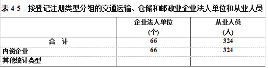 在交通运输、仓储和邮政业企业法人单位从业人员中,内资企业占100%(详见表4-5)