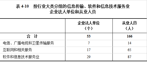 2023年末,全县共有信息传输、软件和信息技术服务业企业法人单位53个,从业人员166人,分别比2018年末增长178.95%和25.76%(详见表4-10)。