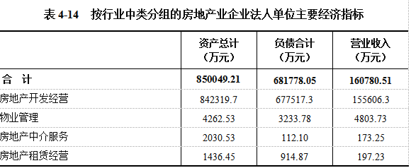 2023年末,全县房地产业企业法人单位的资产总计为85.00亿元,比2018年末增长141.27%。其中,房地产开发经营842319.7万元,物业管理4262.53万元,房地产中介服务2030.53万元,房地产租赁经营1436.45万元。负债合计681778.05万元。全年实现营业收入160780.51万元(详见表4-14)。