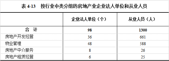 2023年末,全县房地产业企业法人单位的从业人员为1300人,比2018年末下降14.92%。其中,房地产开发经营企业661人,物业管理企业588人,房地产中介服务企业26人(详见表4-13)。