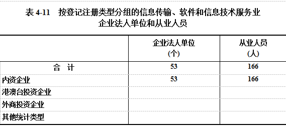 在信息传输、软件和信息技术服务业企业法人单位从业人员中,内资企业占100%(详见表4-11)。