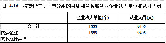 在租赁和商务服务业企业法人单位从业人员中,内资企业占100%(详见表4-16)。