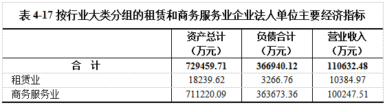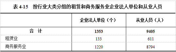在租赁和商务服务业企业法人单位中,租赁业占9.83%,商务服务业占90.17%。在租赁和商务服务业企业法人单位从业人员中,租赁业占6.50%,商务服务业占93.50%(详见表4-15)。