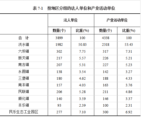 全县产业活动单位共计4338个,各地区产业活动单位具体情况是:洪水镇2318个,占53.43%;六坝镇317个,占7.31%;新天镇226个,占5.21%;南古镇227个,占5.23%;永固镇142个,占3.27%;三堡镇188个,占4.33%;南丰镇163个,占3.76%;民联镇211个,占4.86%;顺化镇146个,占3.37%;丰乐镇100个,占2.31%;民乐生态工业园区300个,占6.92%。按地区分组的单位情况(详见表7-1)。