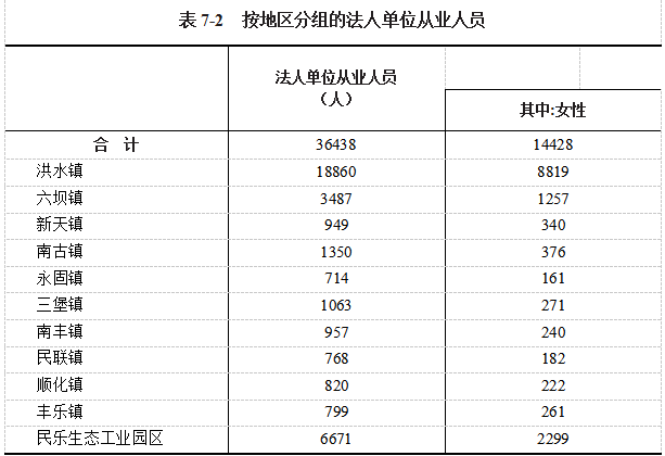 2023年末,全县法定代表人单位从业人员共计36438人,各地区具体法定代表人单位具体情况是:洪水镇18860人,六坝镇3487人,新天镇949人,南古镇1350人,永固镇714人,三堡镇1063人,南丰镇957人,民联镇768人,顺化镇820人,丰乐镇799人,民乐生态工业园区6671人。按地区分组的法定代表人单位从业人员情况(详见表7-2)。