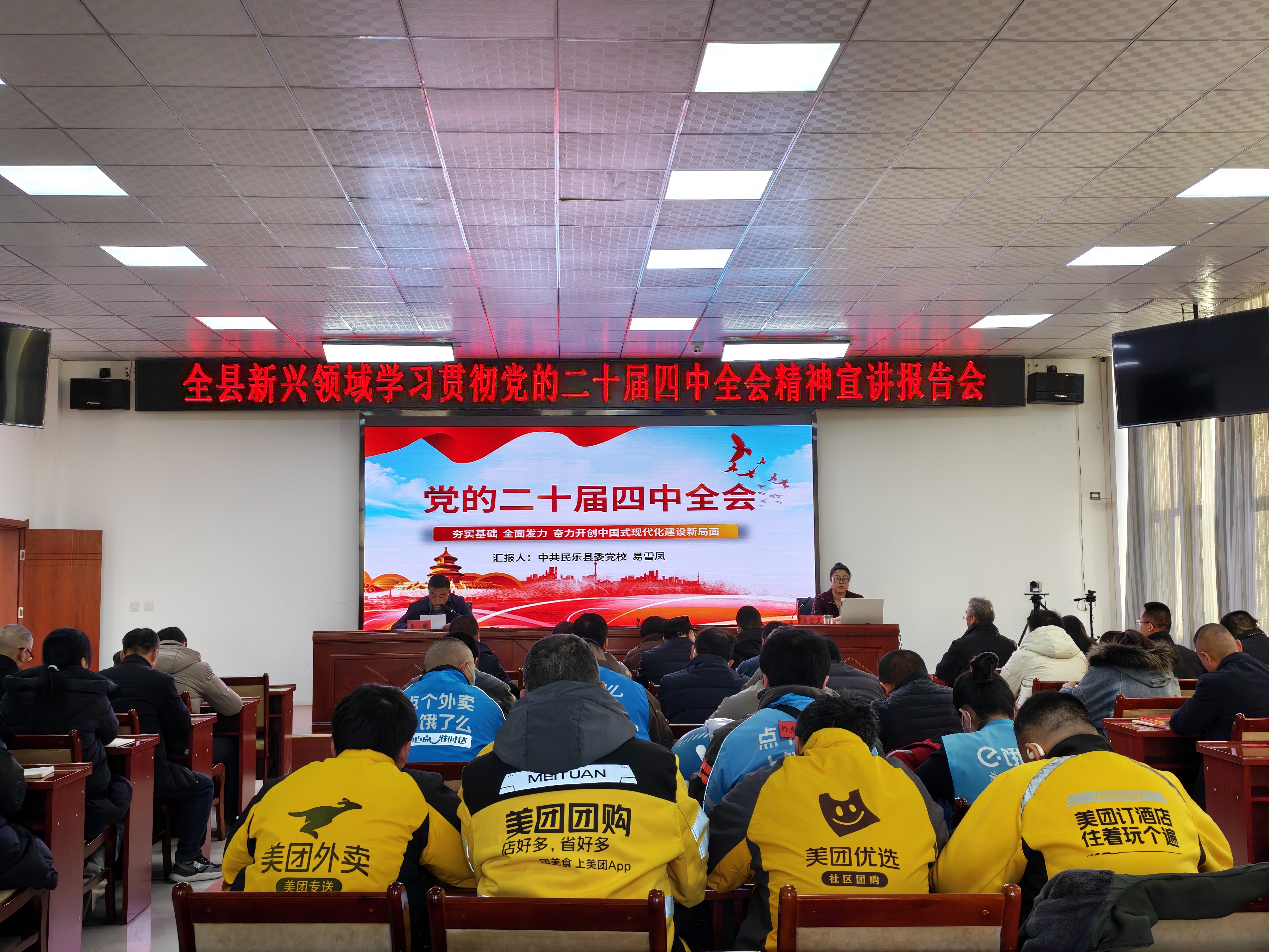 12月11日,民乐县组织召开新兴领域学习贯彻党的二十届四中全会精神宣讲报告会。县委社会工作部全体领导干部、4个行业党委分管负责同志,新经济组织、新社会组织党务干部及快递员、外卖骑手等新就业群体代表80余人参加。