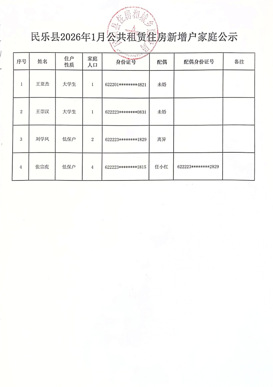 民乐县2026年1月公共租赁住房新增户家庭公示