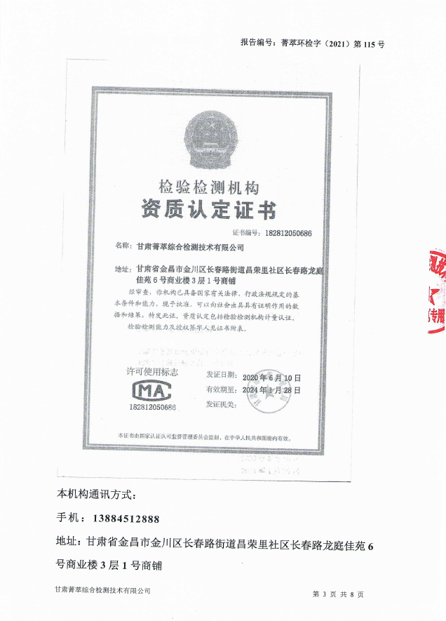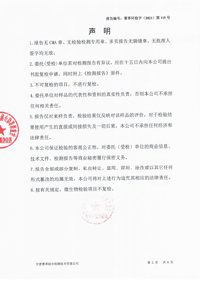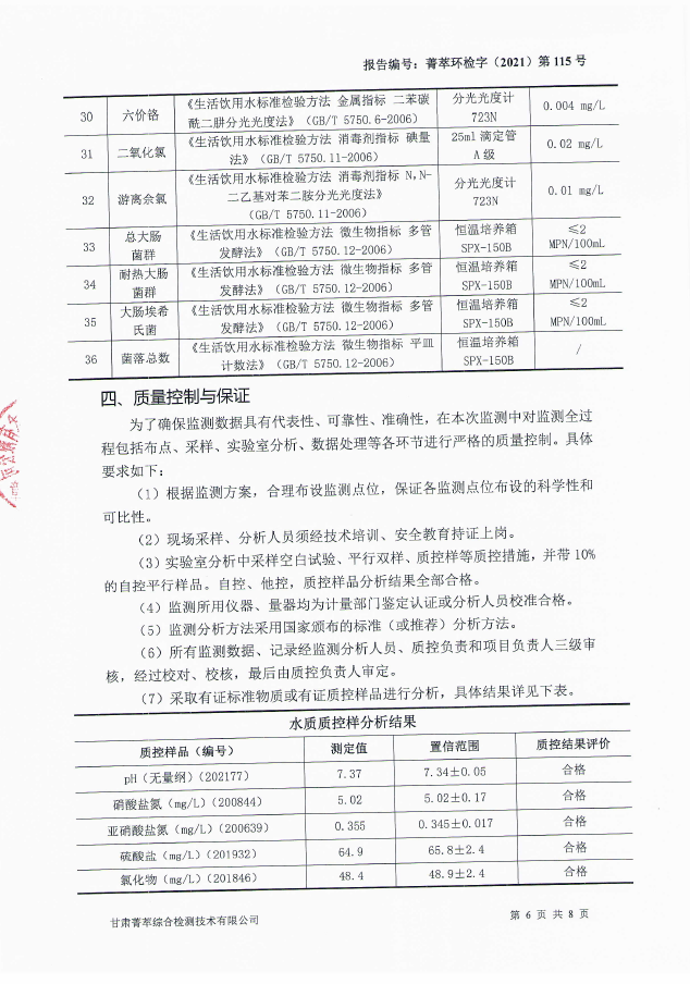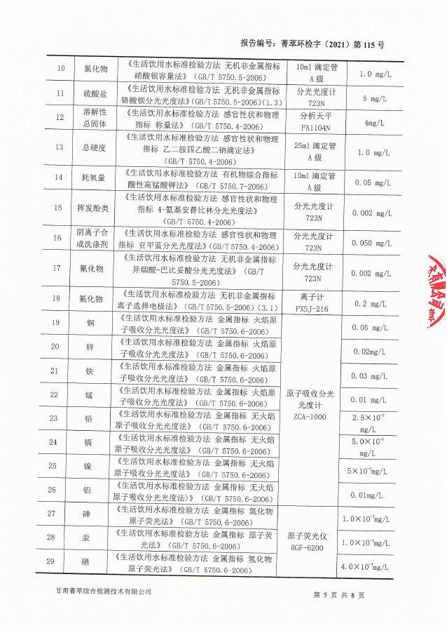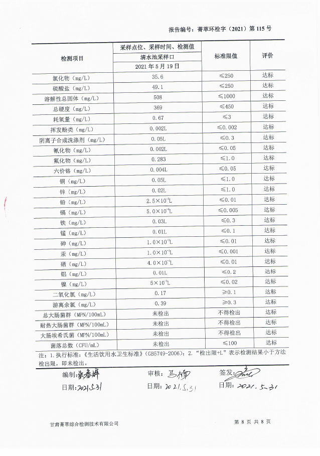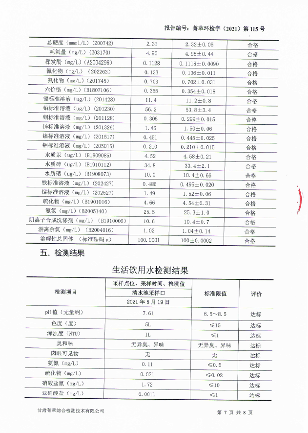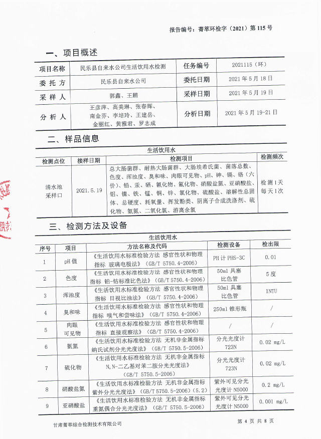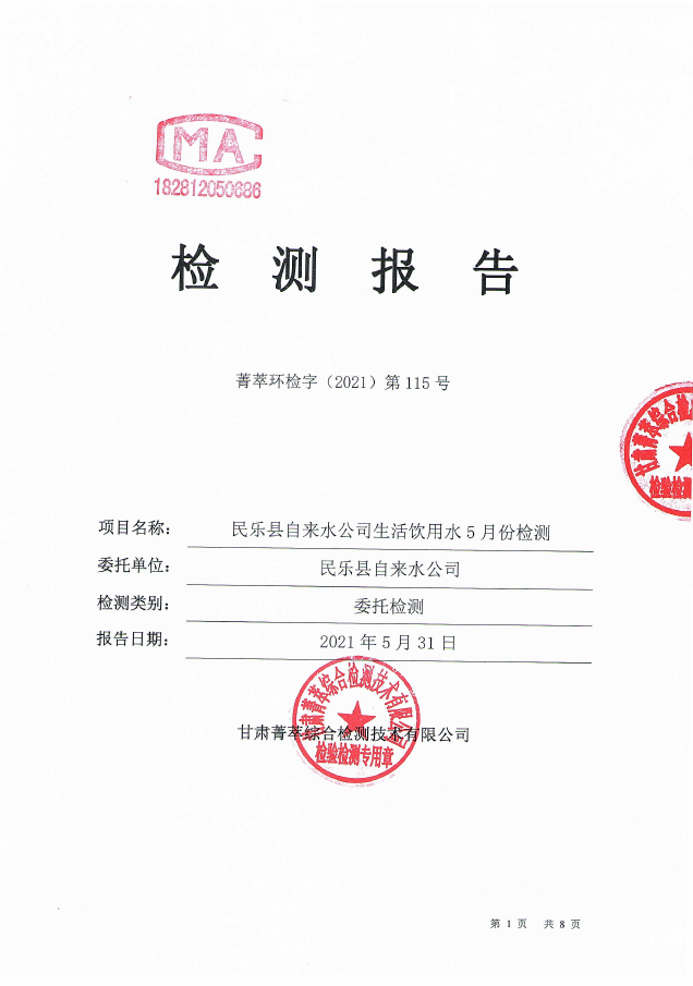 民乐县自来水5月份水质检测报告